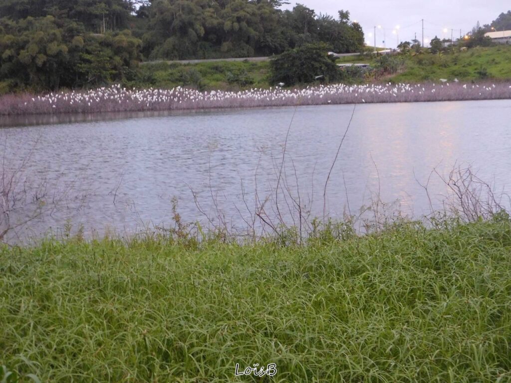 A la tombée de la nuit, les hérons garde-bœufs se regroupent sur les berges du barrage …. un spectacle magnifique.